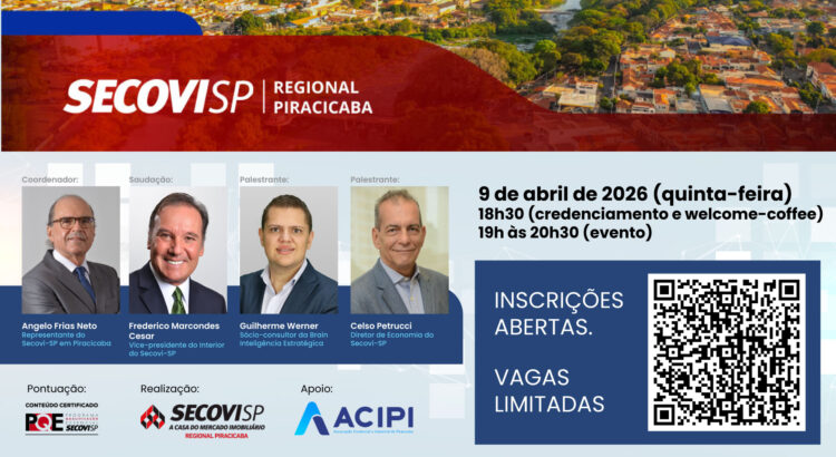 Piracicaba recebe, no dia 9 de abril, um importante encontro voltado ao setor imobiliário. Promovido pelo Secovi-SP, o evento trará a apresentação dos dados consolidados do mercado imobiliário da cidade em 2025, reunindo profissionais, investidores e interessados em entender as tendências e oportunidades do segmento. A programação contará com a divulgação de um estudo completo […]